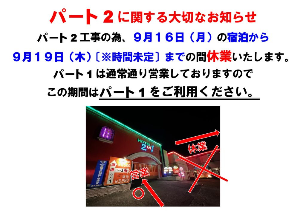 ※パート2(Cタイプのお部屋)のみ休業いたします。